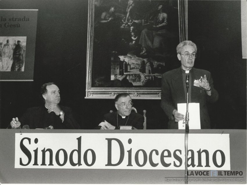 conferenza sinodo diocesano di torino con don perrù, il cardinale giovanni saldarini e don renzo savarino