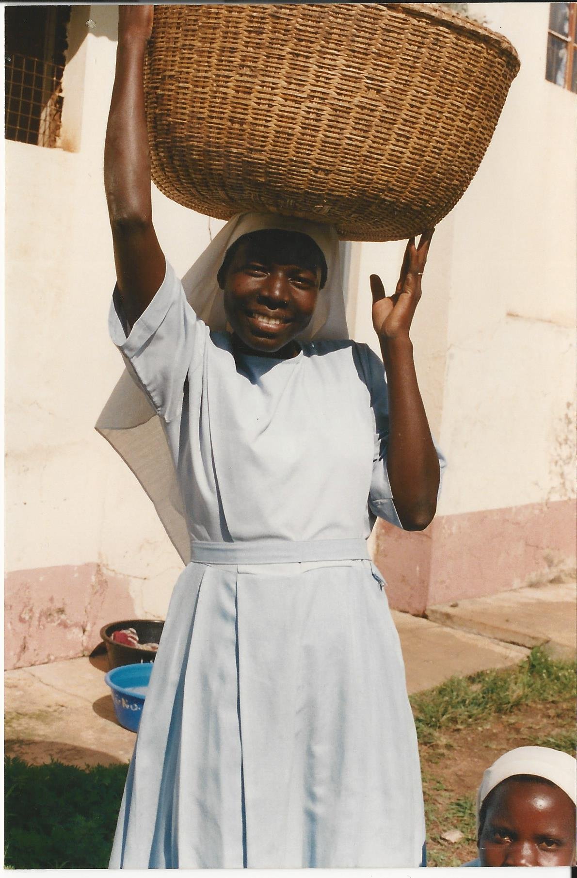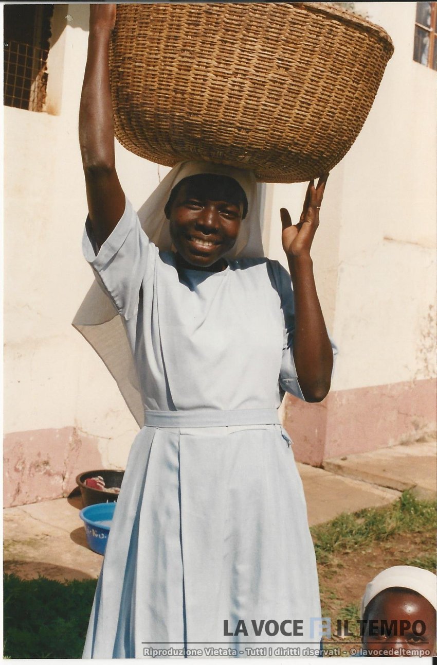 suora africana che porta sul capo una cesta. Dice: "Il mio peso è leggero"