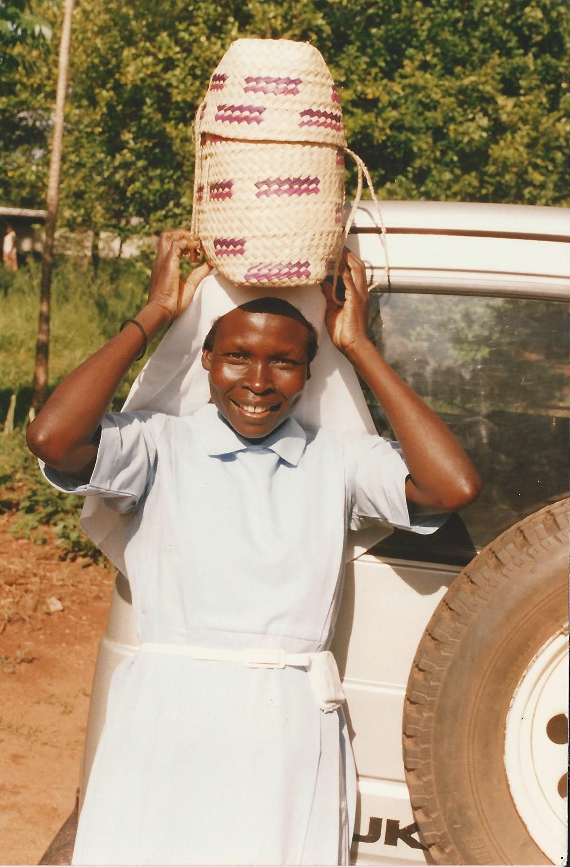 Scatto di una suora sorridente che trasporta una borsa durante una missione in Africa
