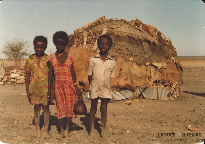 tre bambini davanti a una capanna