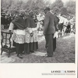 Cardinale Murilio Fossati affiancato da un altro prete a Torino durante una celebrazione con gli scout