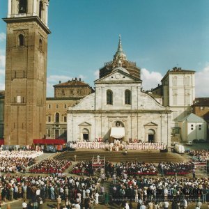 Fedeli in piazza Vittorio Veneto in attesa dell'arrivo di papa Wojtyla