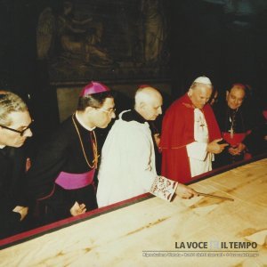 Il papa Giovanni Paolo II saluta le autorità locali davanti al santuario della Consolata; di fianco a lui, il sindaco Novelli