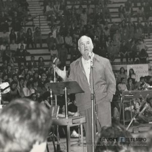 Fratel Carlo Carretto parla ai giovani nel palasport di Torino, nel "Pomeriggio di speranza" organizzato dal Sermig