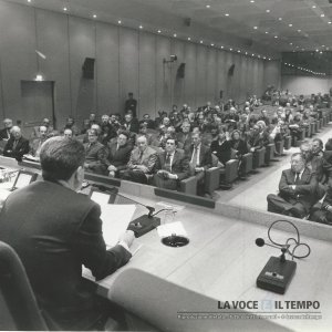 il cardinale saldarini è alla fondazione Agnelli, per un convegno sulla Sindone. il cardinale parla con ludovico passerin d'entreves