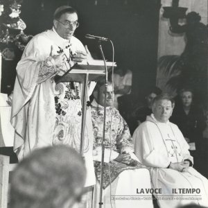 Cardinale Murilio Fossati affiancato da un altro prete a Torino durante una celebrazione con gli scout