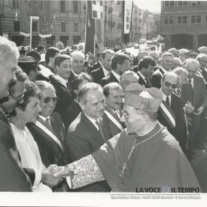 Cardinale Saldarini, Valerio Zanone, Guido Bodrato, Giampaolo Brizio e Sergio Ricca alla manifestazione presso le Porte Palatine a Torino