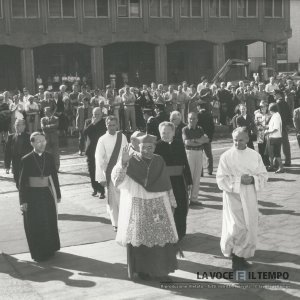 monsignor Micchiardi celebra una messa in piazza San Carlo davanti a una folla di fedeli