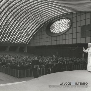 Il papa Giovanni Paolo II saluta i fedeli nella sala Nervi, a Roma